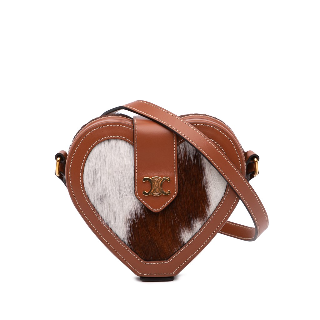This crossbody bag features a pony hair and calfskin leather body, an adjustable flat leather strap, and a top strap with snap button closure.