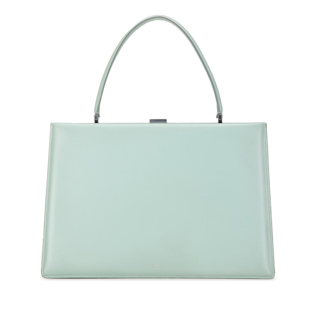 The Clasp tote features a leather body, a flat leather handle, a top metal clasp closure, and an interior zip compartment.