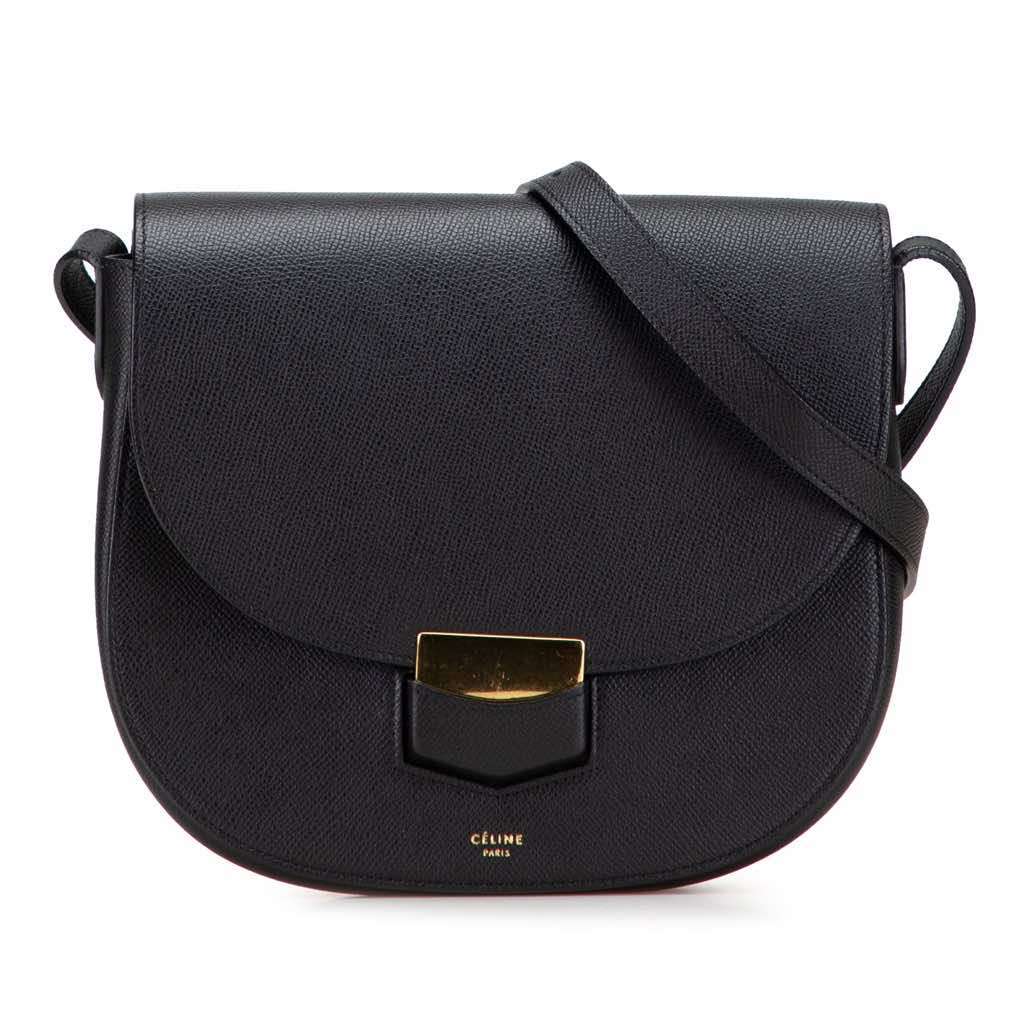 The Trotteur features a leather body, an adjustable flat leather shoulder strap, a front flap with a tuck-in closure, an exterior back slip pocket, and interior slip pockets.