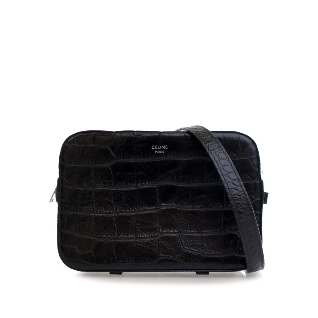 This crossbody bag features an embossed leather body, a flat leather shoulder strap, a top zip around closure, and an interior slip pocket.