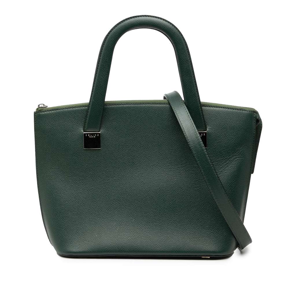 This satchel features a grained calfskin leather body, flat leather handles, a top zip closure, a flat leather strap, and interior zip and slip pockets.