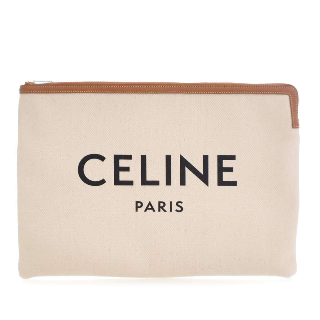 This clutch features a canvas body with leather trim, and a top zip closure.