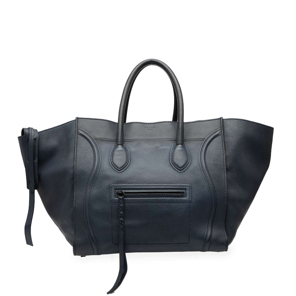 The Phantom Luggage tote bag features a leather body, rolled leather handles, an open top, an exterior front zip pocket, and an interior zip pocket.