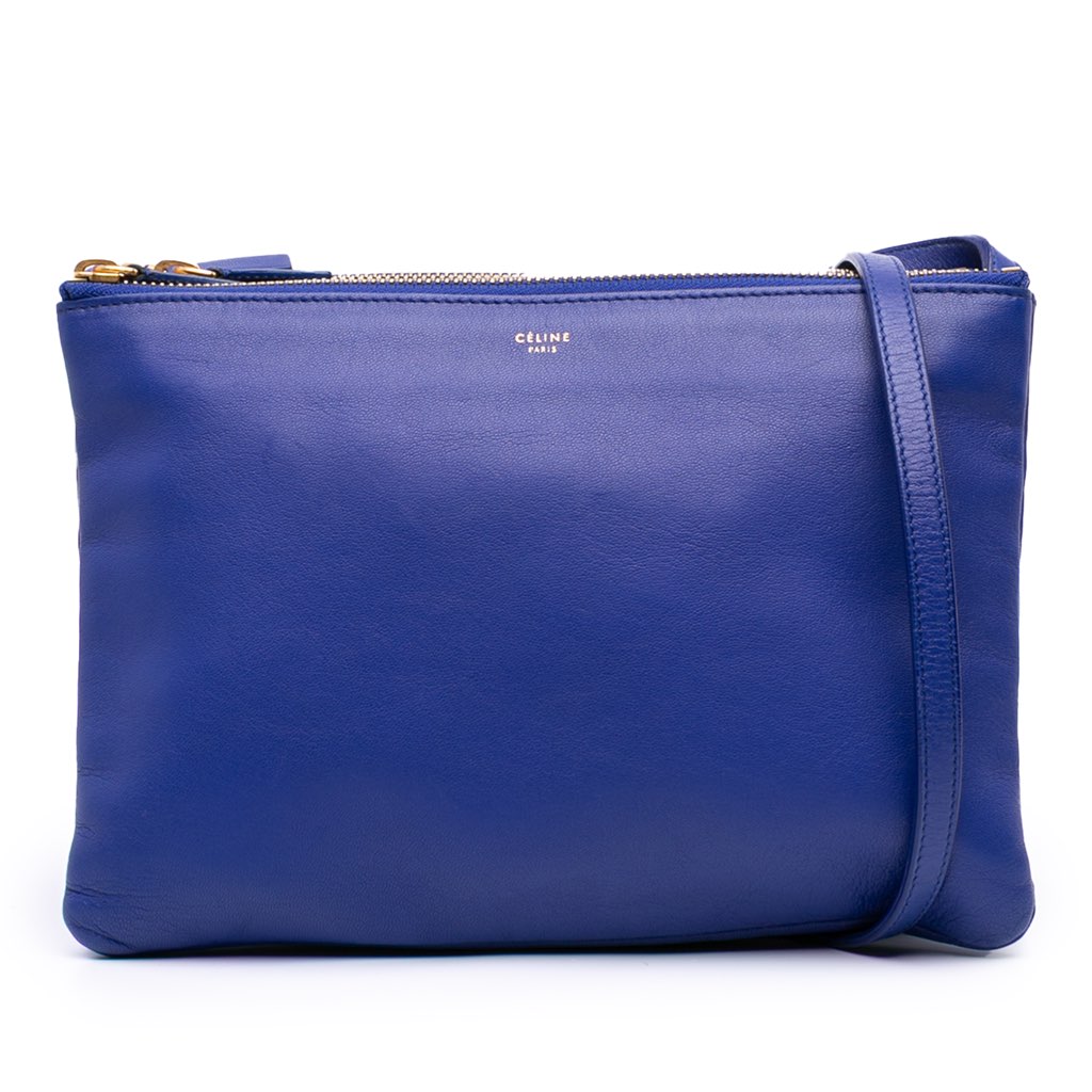 The Trio crossbody bag features a lambskin leather body, a flat strap, and three compartments with top zip closures.