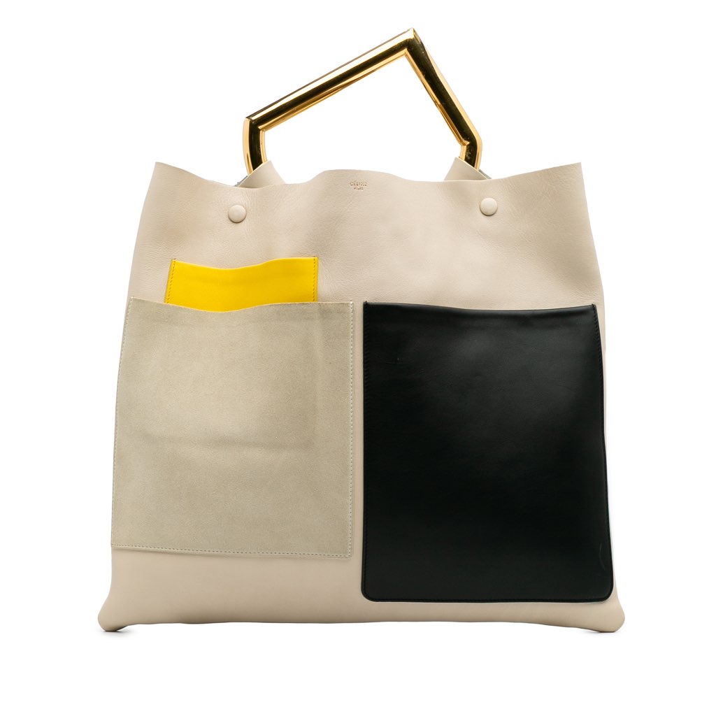 The Geometric tote bag features a calf leather body, a rolled metal hardware handle, an open top with snap button closures, exterior front slip pockets, and interior zip and slip pockets.