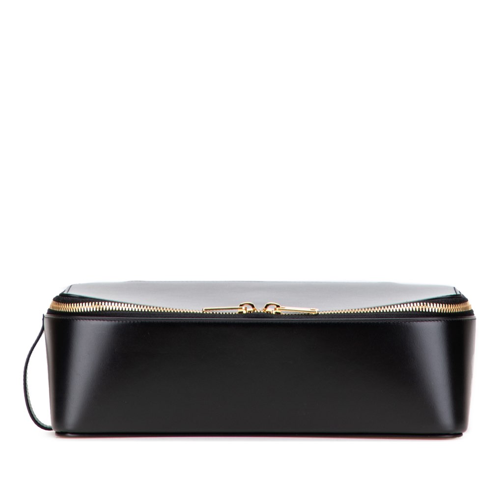 This pouch features a leather body, a flat leather handle, and a two-way zip around closure.