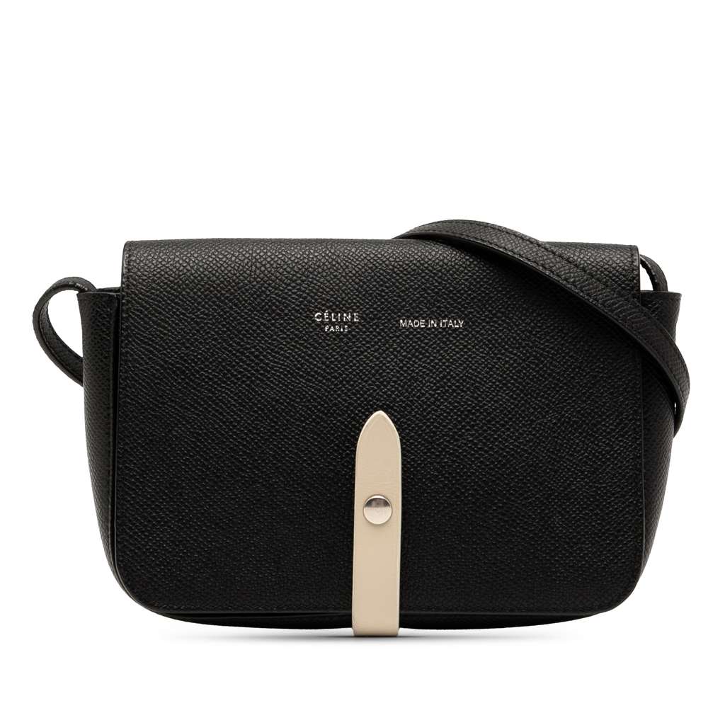 This crossbody bag features a leather body, a flat leather strap, a front snap button closure, and an interior slip pocket.