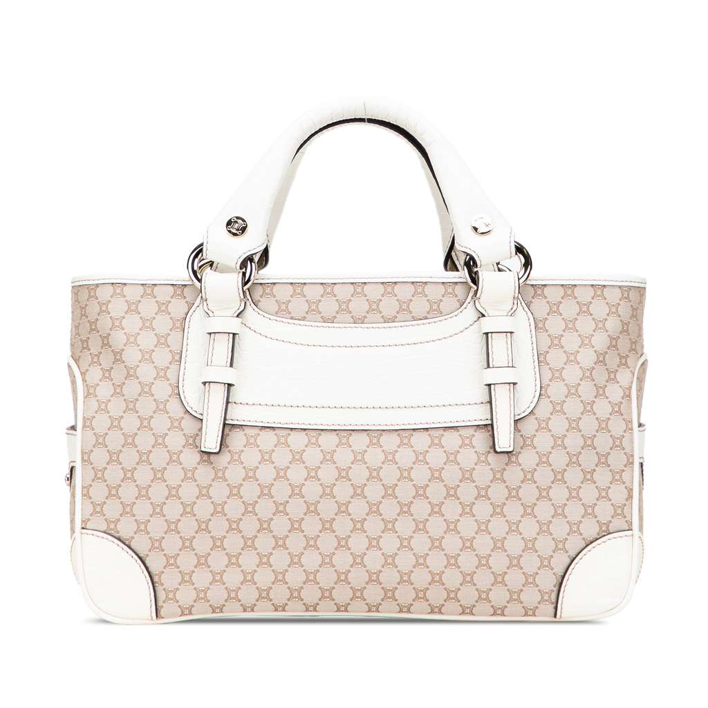 The Boogie features a canvas body with embossed leather trim, rolled leather handles, an open top, an interior zip compartment, and an interior slip pocket.