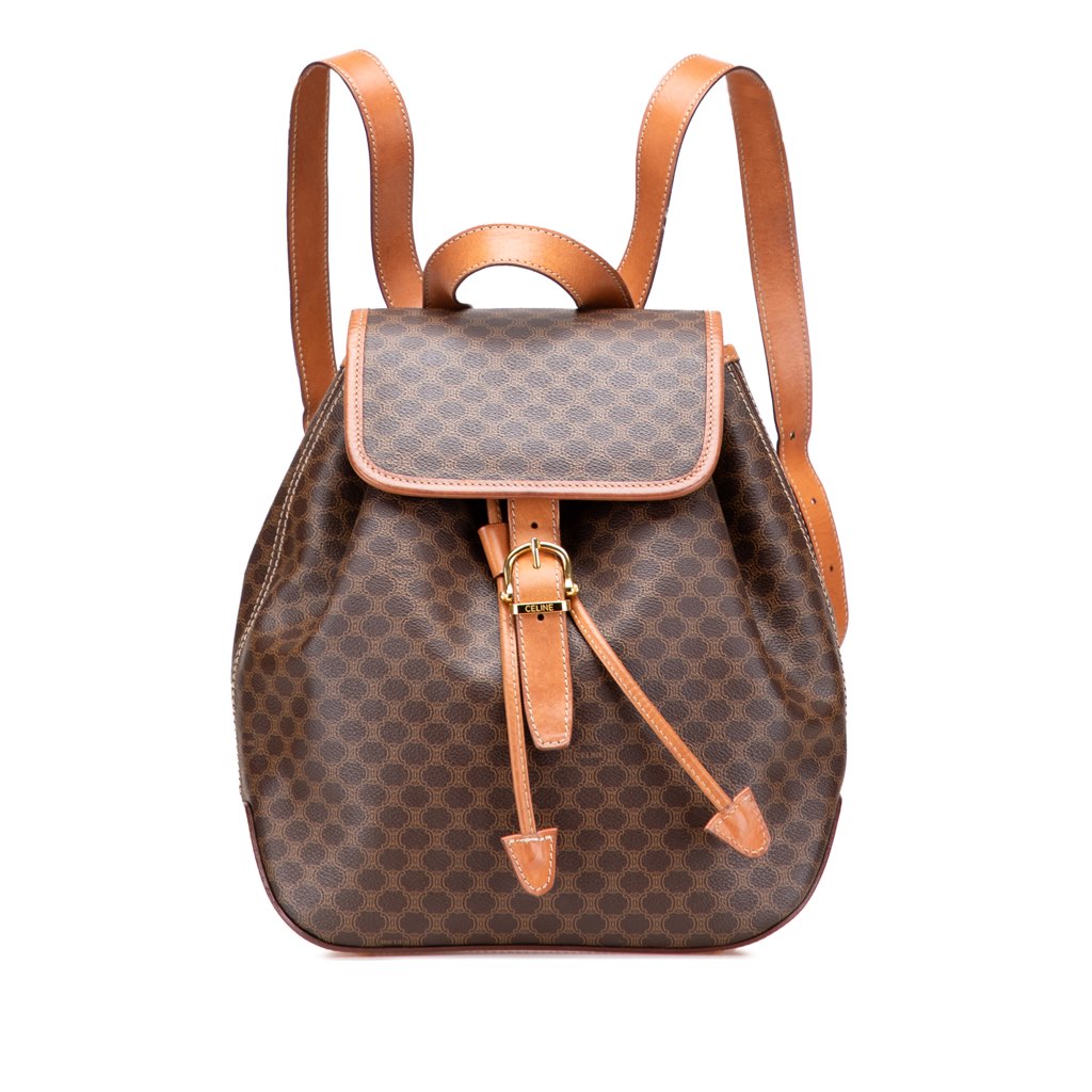 This backpack features a coated canvas body with leather trim, a flat leather top handle, adjustable flat back straps, a top flap with buckle closure, a top drawstring closure, and an interior zip pocket.
