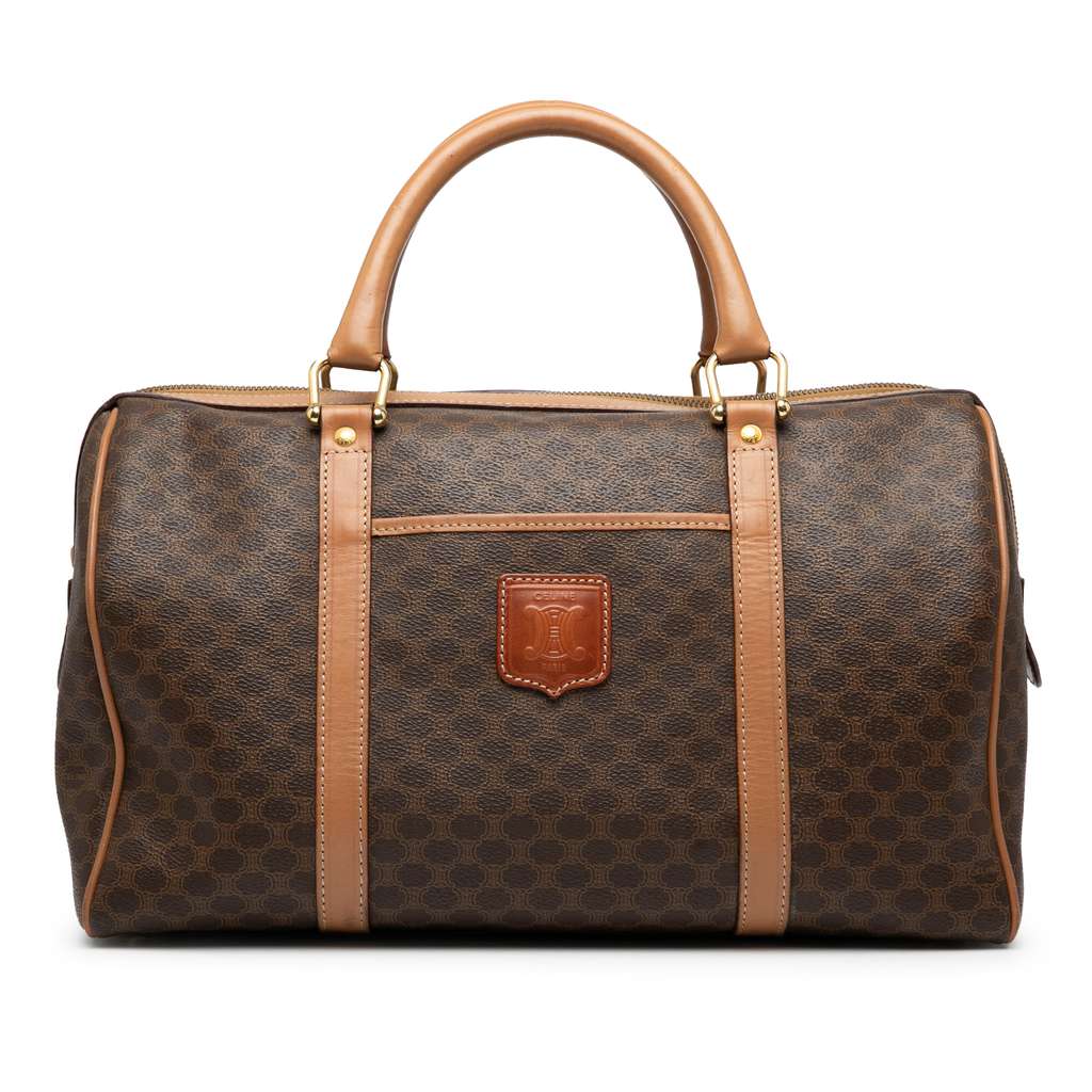 This boston bag features a coated canvas body with leather trim, rolled leather top handles, a top zip closure, and an interior zip pocket.