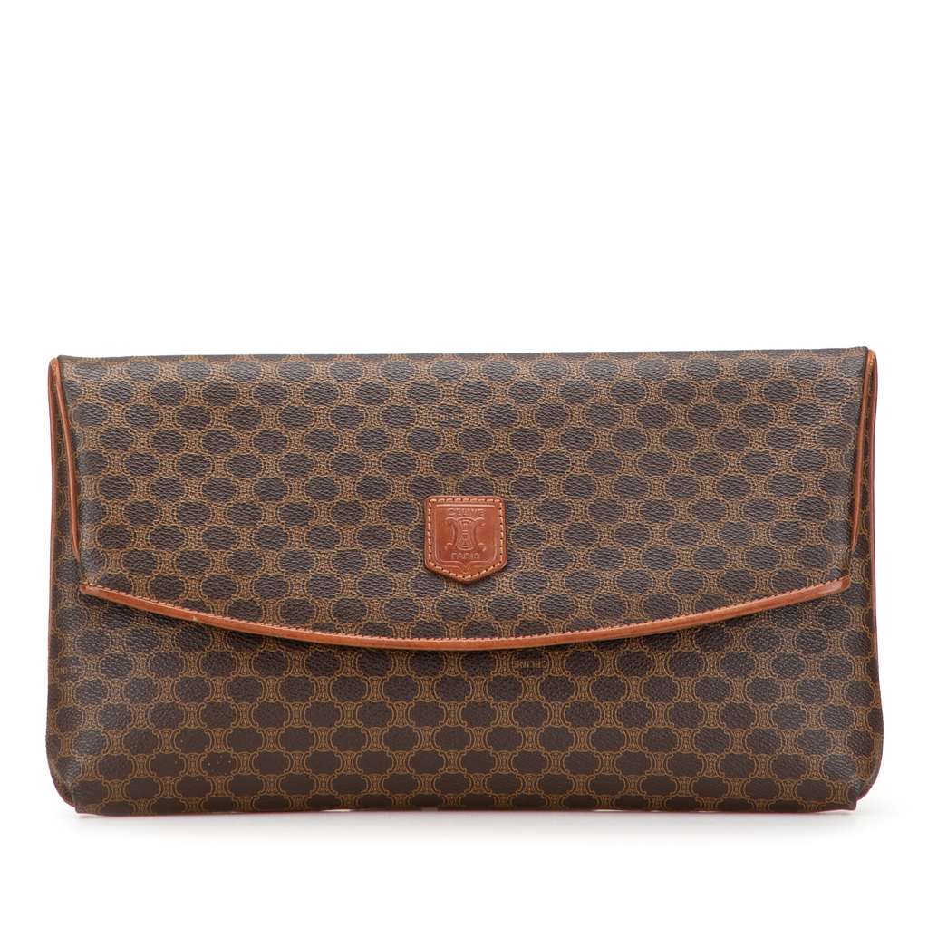 This clutch bag features a coated canvas body with leather trim, a fold over top with magnetic snap closure, and an interior slip pocket.
