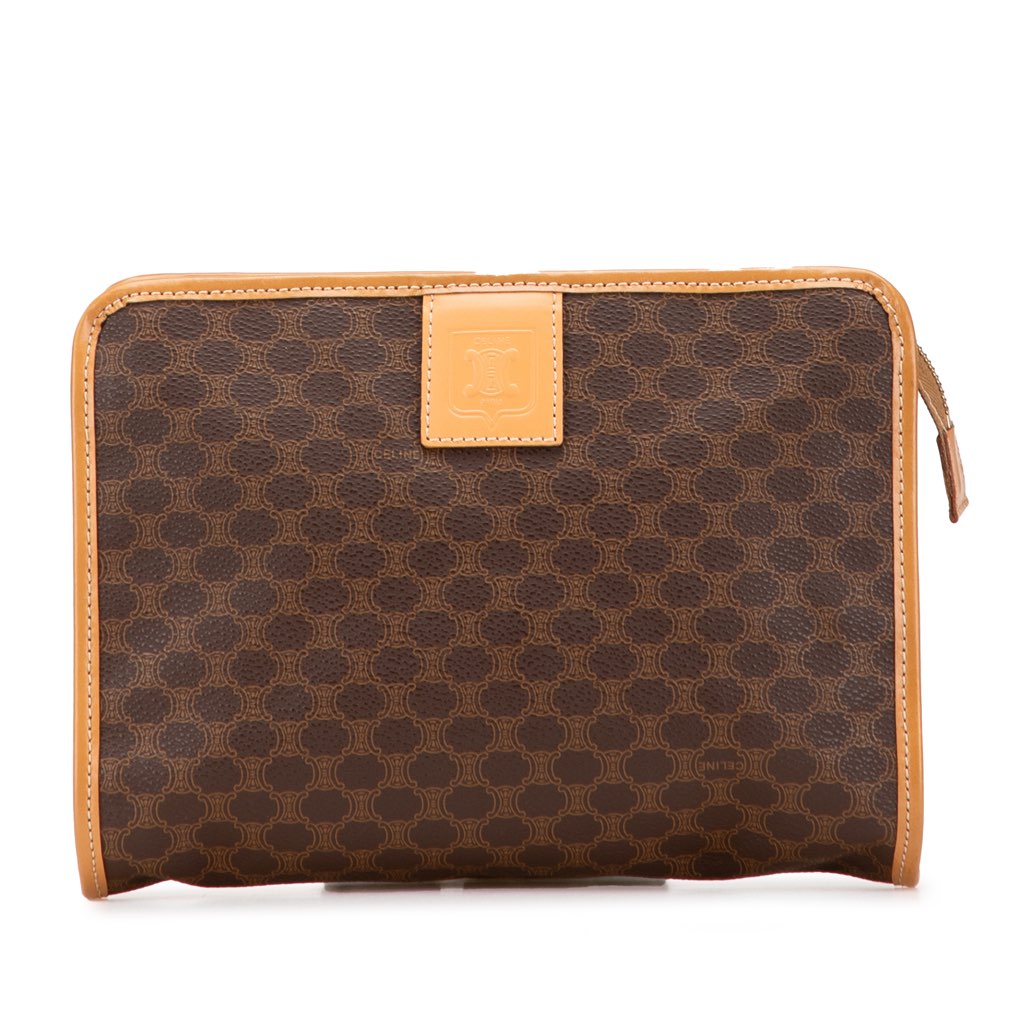 This clutch bag features a coated canvas body with leather trim, and a top zip closure.