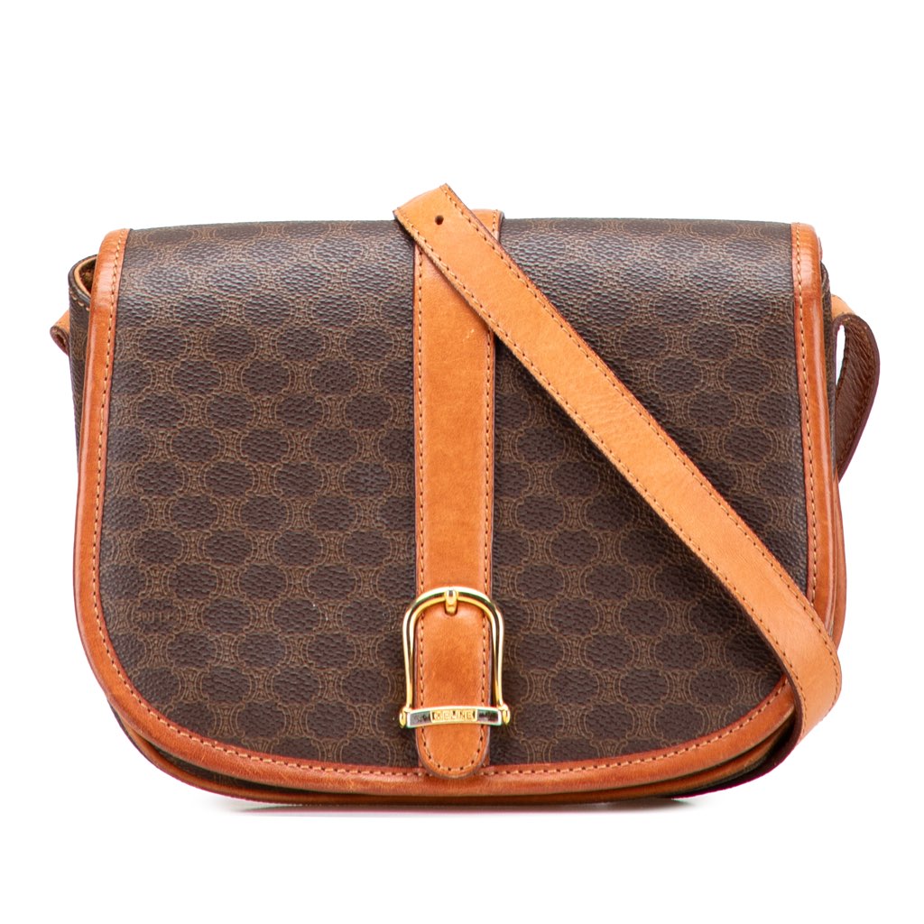 This crossbody bag features a coated canvas body with leather trim, a flat leather strap, a front flap with magnetic snap closure, and an interior zip pocket.