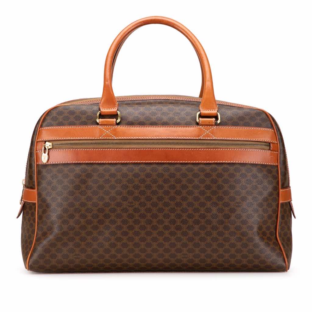 This travel bag features a coated canvas body with leather trim, rolled leather handles, a top zip closure, and an exterior front zip compartment.