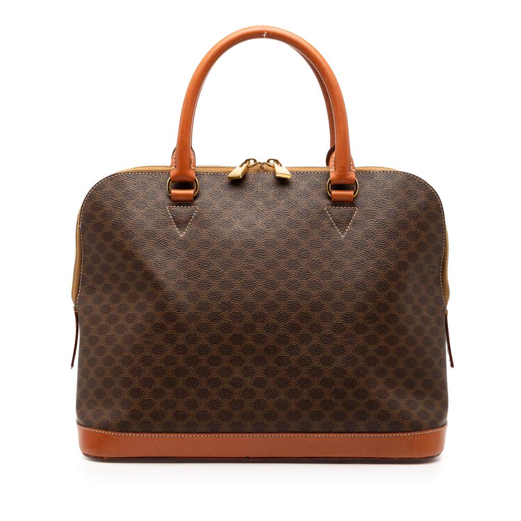 This handbag features a coated canvas body with leather trim, rolled leather handles, 2 way top zip closure, and an interior zip pocket.