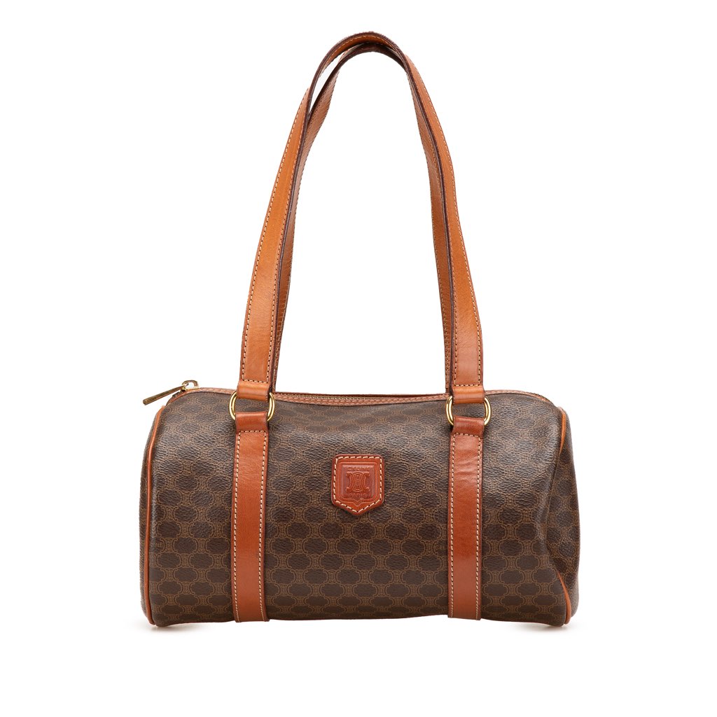 This shoulder bag features a coated canvas body with leather trim, flat leather straps, a top zip closure, and an interior zip pocket.