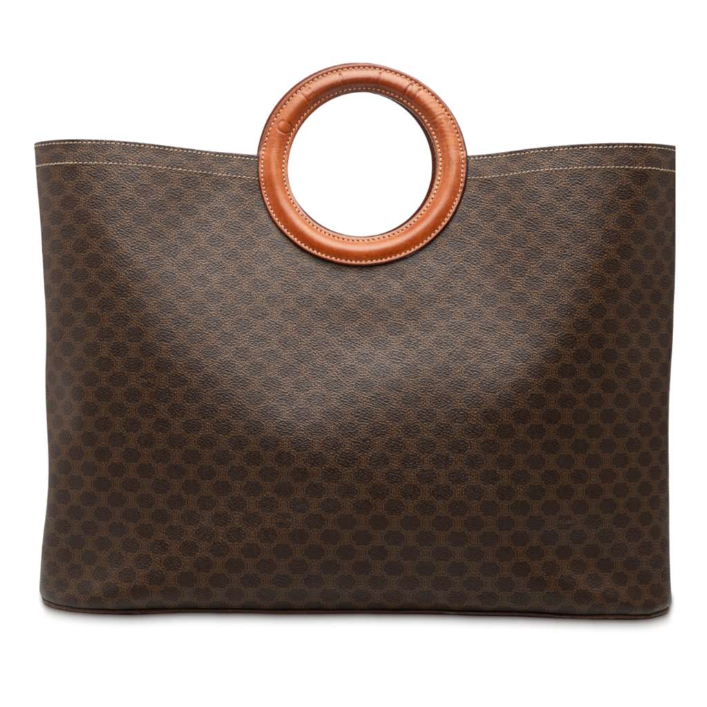 This tote features a coated canvas body with leather trim, flat leather handles, an open top, and an interior zip pocket.