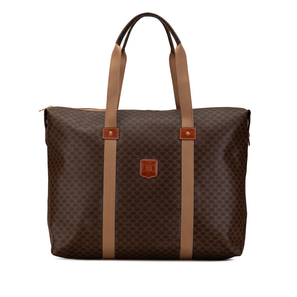 This travel bag features a coated canvas body with canvas trim, flat handles, a top zip closure, and an interior zip pocket.