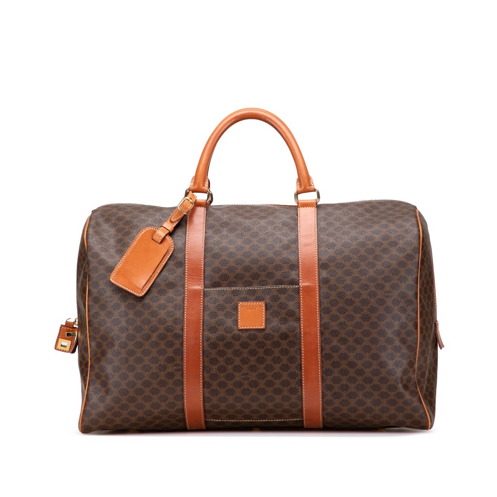 This travel bag features a coated canvas body with leather trim, rolled leather handles, a top zip closure, an exterior slip pocket, and an interior slip pocket.