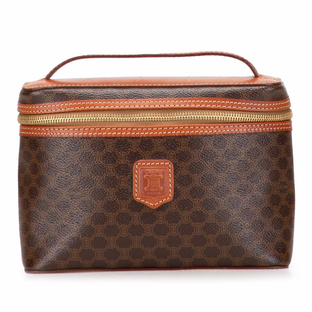 This vanity bag features a coated canvas body with leather trim, a flat top handle, and a top zip around closure.