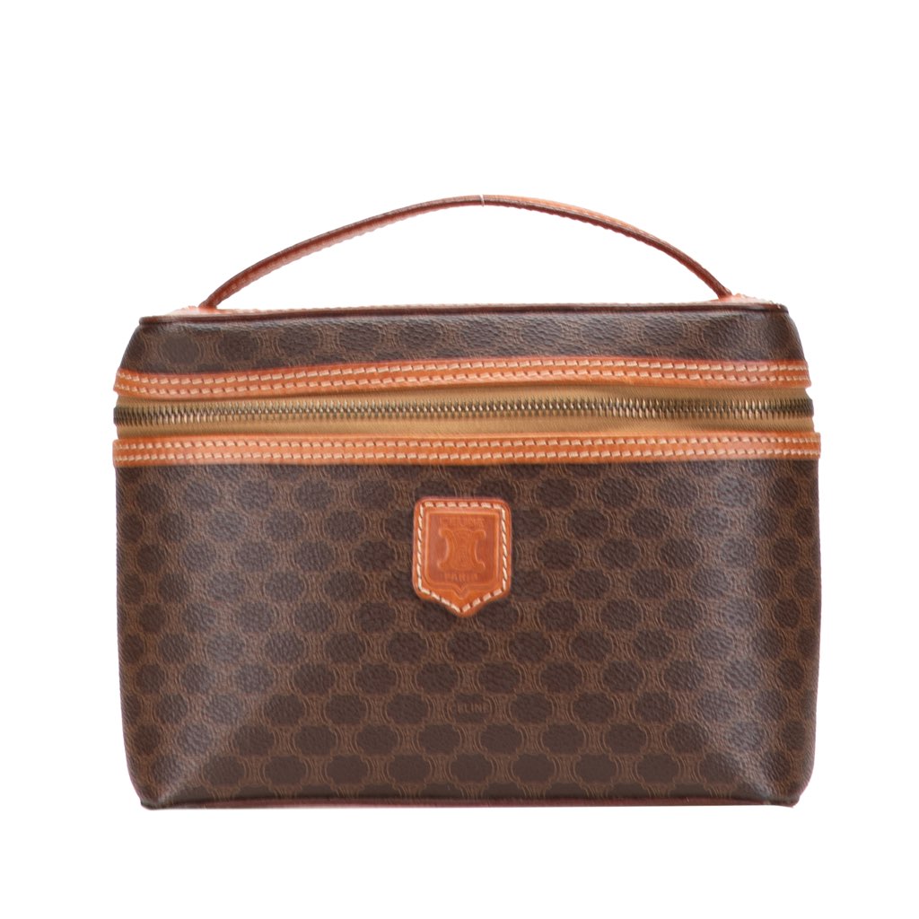 This vanity bag features a coated canvas body with leather trim, a flat leather top handle, and a top zip-around closure.