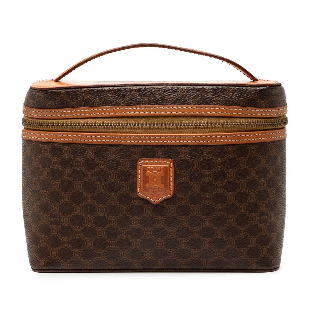 This vanity bag features a coated canvas body with leather trim, a flat leather top handle, and a top zip-around closure.