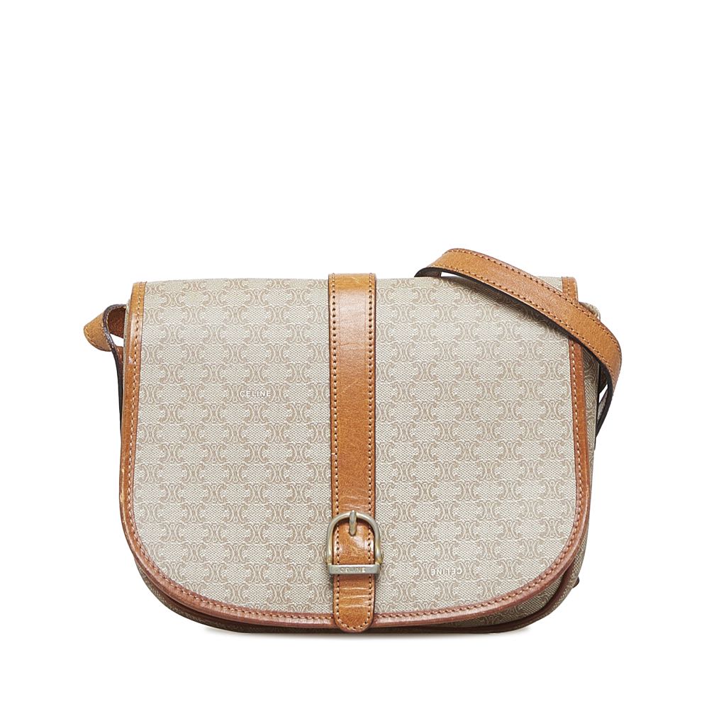 This crossbody bag features a coated canvas body with leather trim, a flat leather strap, and a front flap with a magnetic snap button closure.