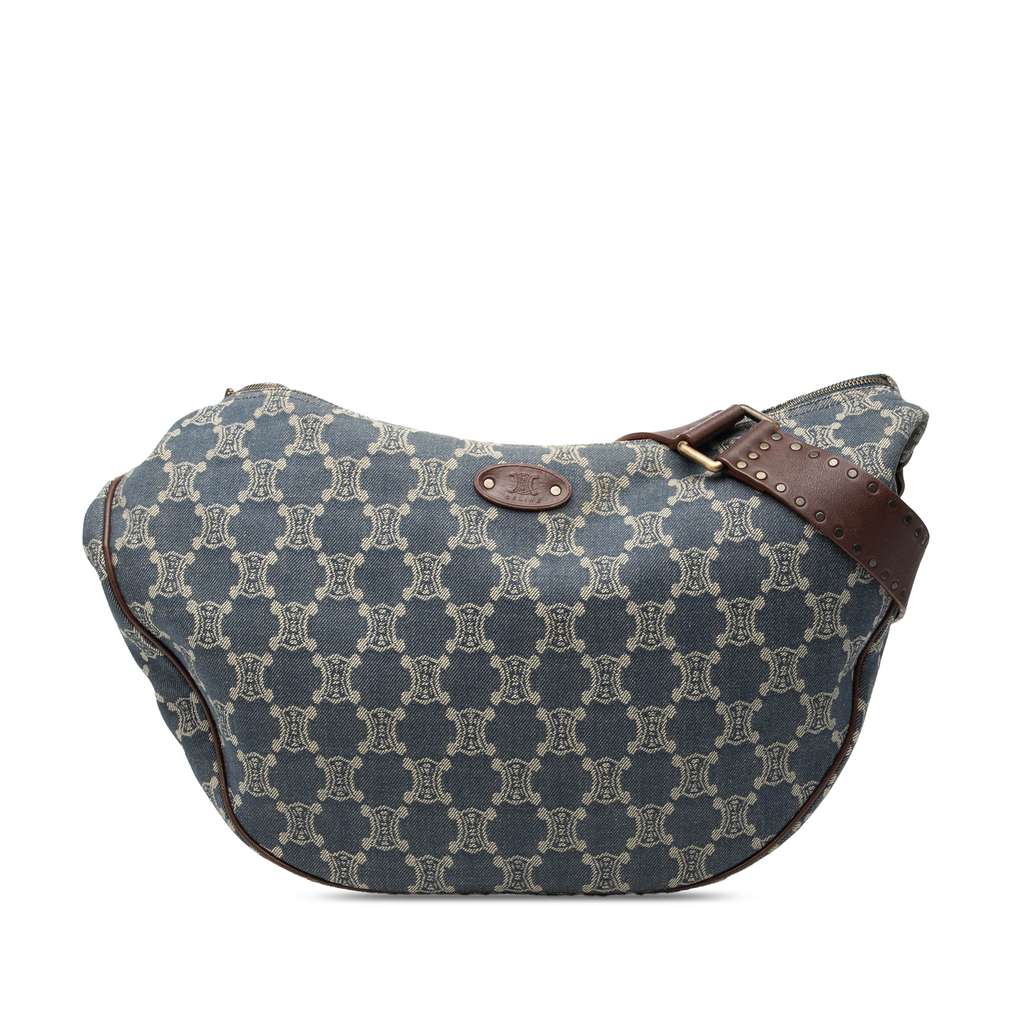 The Macadam crossbody bag features a denim body, an adjustable flat leather strap, a top zip closure, and an interior zip pocket.