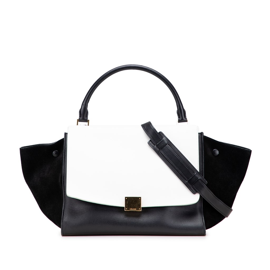 The Trapeze features a leather body with suede leather side panels, a rolled top handle, a detachable flat leather strap, a front flap with clasp closure, a top zip closure, an exterior back zip pocket, and interior slip pockets.