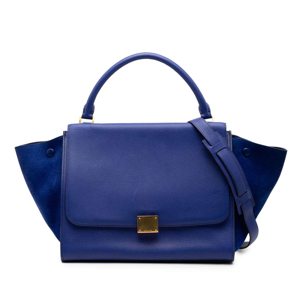 The Trapeze features a leather body with suede leather side panels, a rolled top handle, a detachable flat leather strap, a front flap with clasp closure, a top zip closure, an exterior back zip pocket, and interior slip pockets.