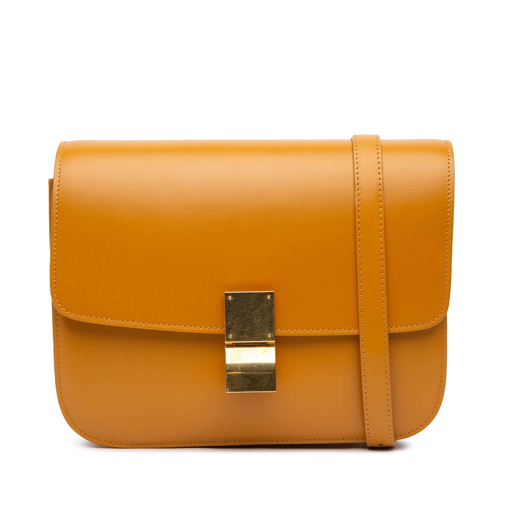 This crossbody bag features a leather body, an adjustable flat leather shoulder strap, a front flap with a metal clasp closure, and interior zip and slip pockets.