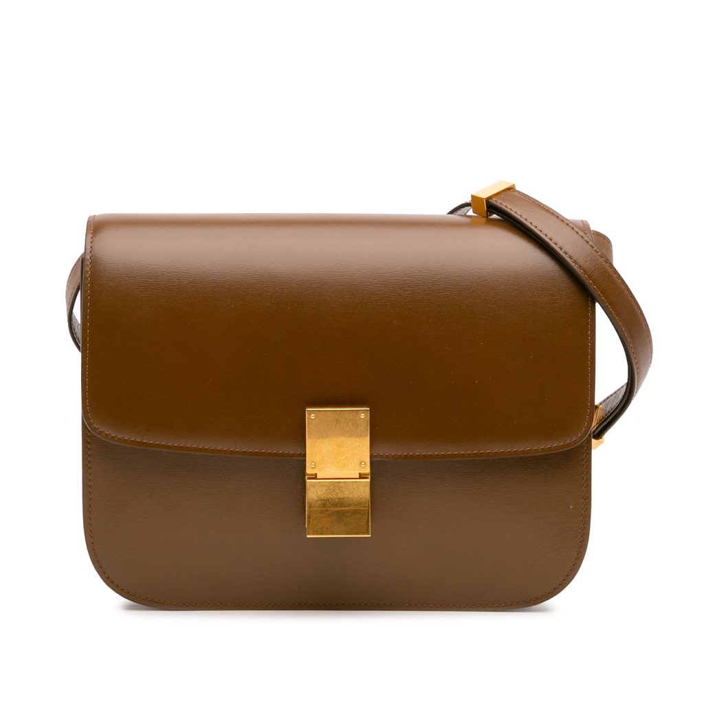 The Classic Box bag features a leather body, a flat leather strap, a front flap with a push lock closure, and interior slip pockets.