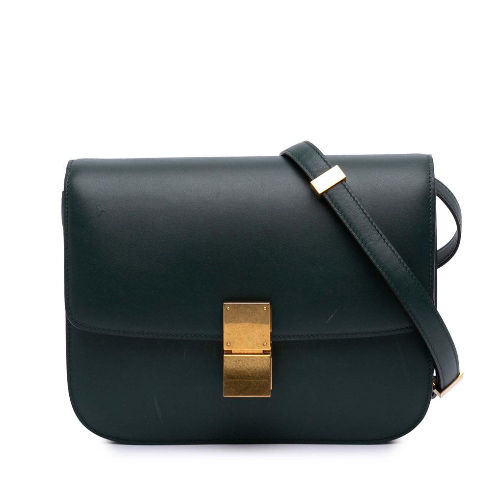This crossbody bag features a leather body, a detachable flat strap, a front flap with a metal clasp closure, and interior zip and slip pockets.