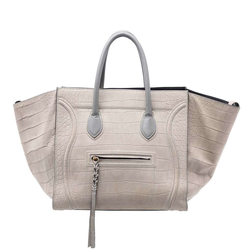 The Phantom Luggage Tote bag features a croc embossed leather body, rolled leather handles, an open top, an exterior front zip pocket, and an interior zip pocket.