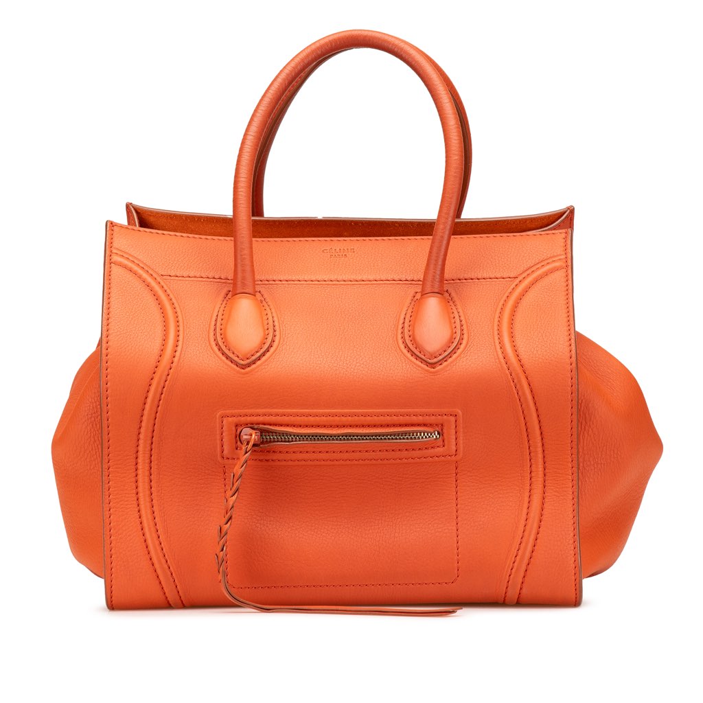 The Phantom Luggage Tote bag features a leather body, rolled leather handles, an open top, an exterior front zip pocket, and an interior zip pocket.