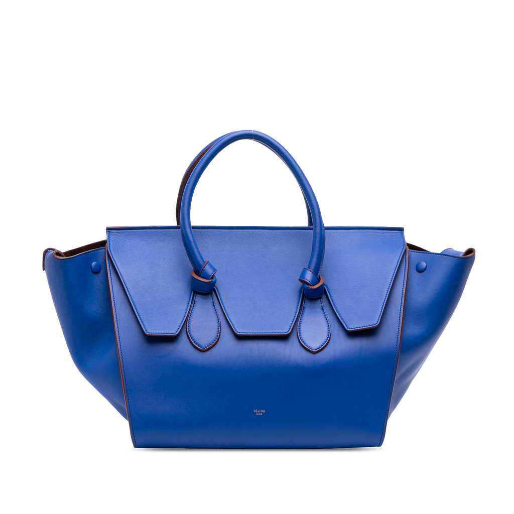 The Tie Knot tote bag features a leather body, rolled leather handles, a top flap, and interior zip and slip pockets.