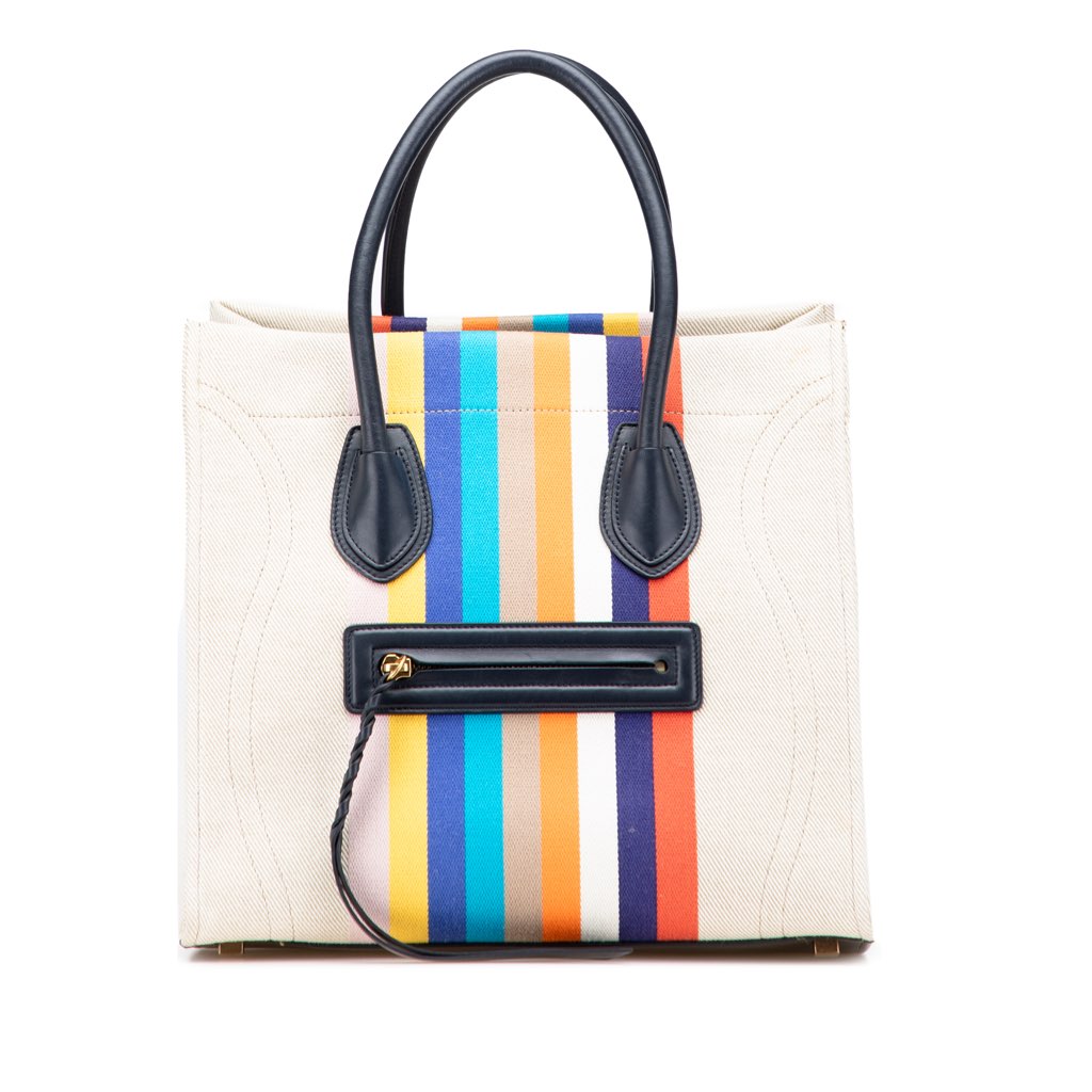 The Phantom tote bag features a canvas body with leather trim, rolled leather handles, an open top with pull-through closure, an exterior front zip pocket, and an interior zip pocket.