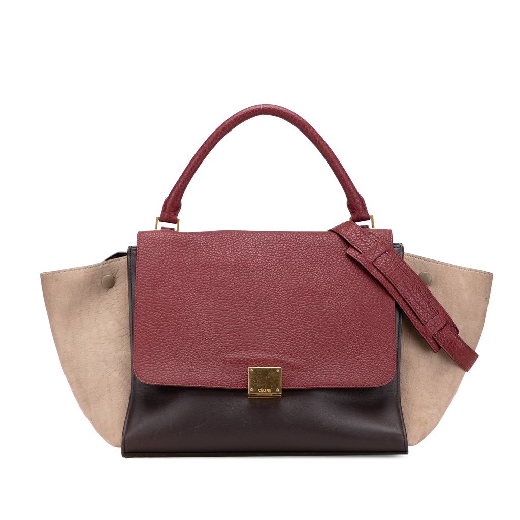 The Trapeze features a leather body with suede leather side panels, a rolled top handle, a detachable flat leather strap, a front flap with clasp closure, a top zip closure, an exterior back zip pocket, and interior slip pockets.