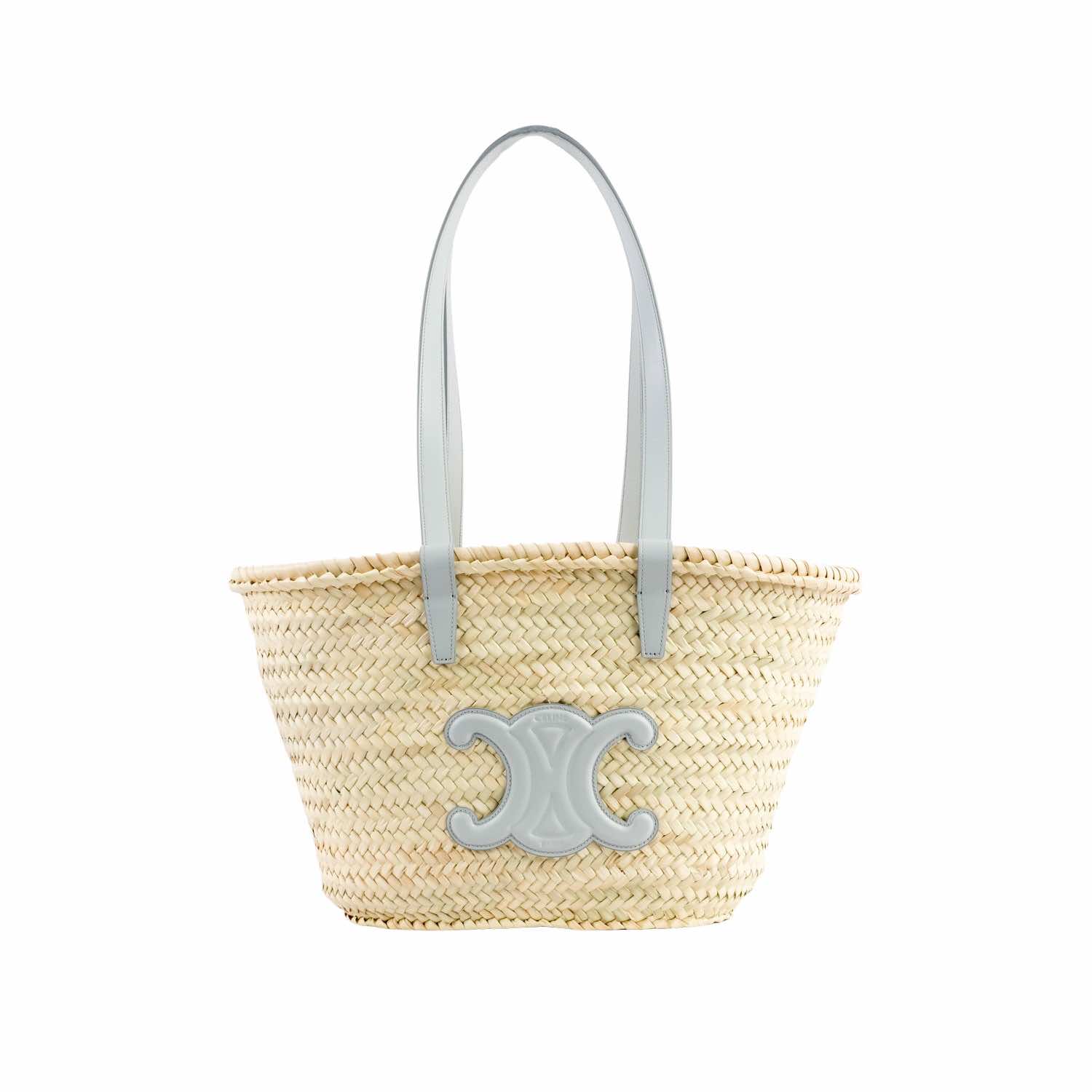 Celine Medium Triomphe classic Panier in palm leaves & calfskin leather, large logo triomphe in soft blue & two top leather handles, new w/ tag