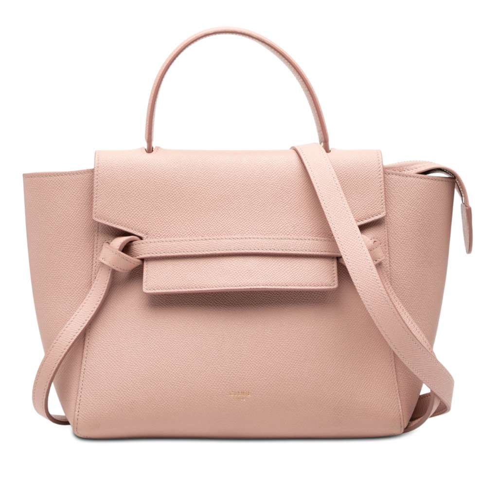 The Nano Belt Bag features a leather body, a flat leather handle, a flat and detachable leather strap, a front flap with magnetic snap closure, and a top zip closure.