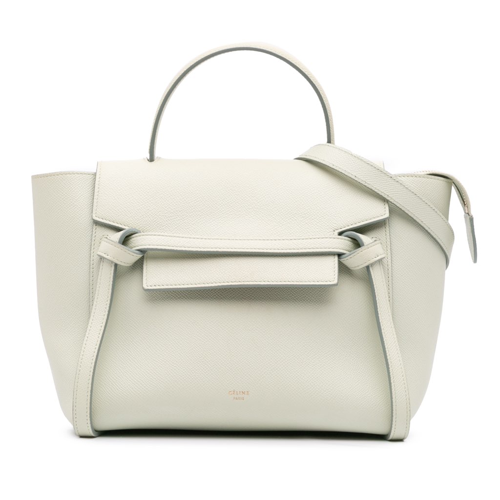 The Belt bag features a leather body, a flat leather handle, a detachable leather strap, a front flap with a slip-through closure, a top zip closure, and an exterior zip pocket.