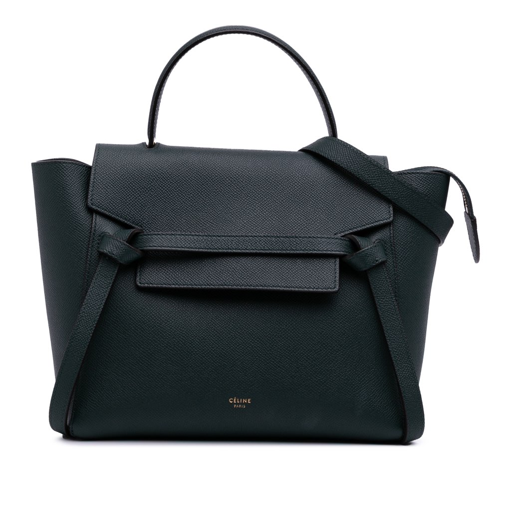 The Belt bag features a leather body, a flat leather handle, a detachable leather strap, a top flap with slip-through closure, and a top zip closure.