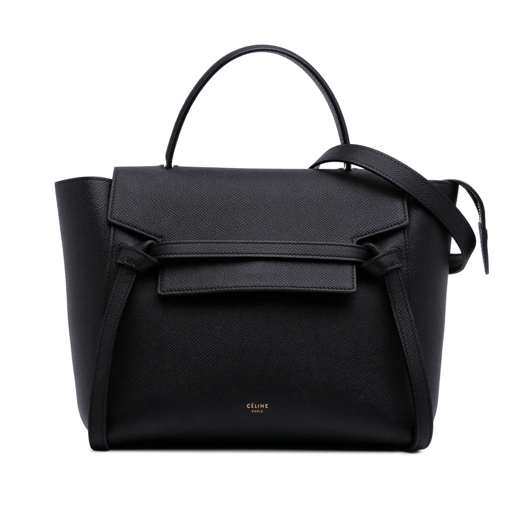 The Belt bag features a leather body, a flat leather handle, a detachable leather strap, a top flap with slip-through closure, and a top zip closure.