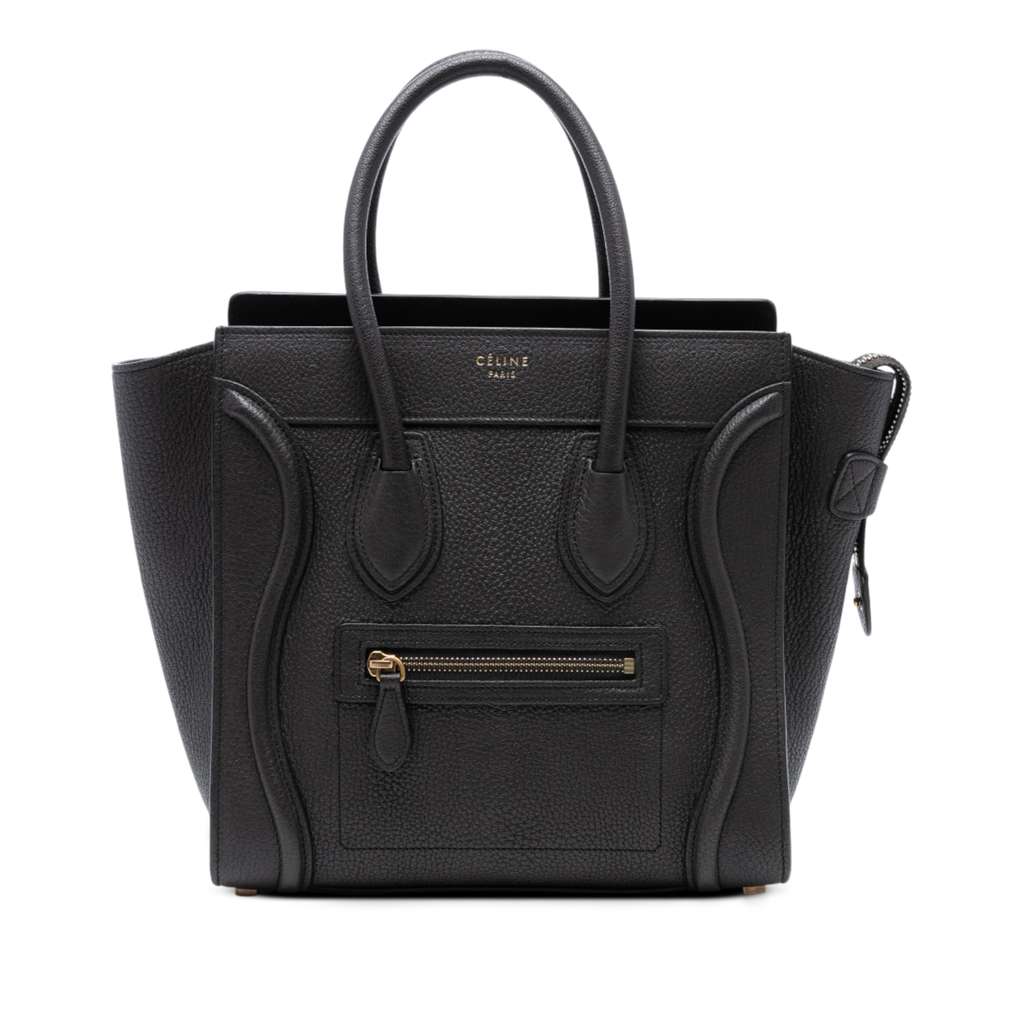 The Micro Luggage Tote features a leather body, rolled leather handles, a top zip closure, a front exterior zip pocket, and interior zip and slip pockets.