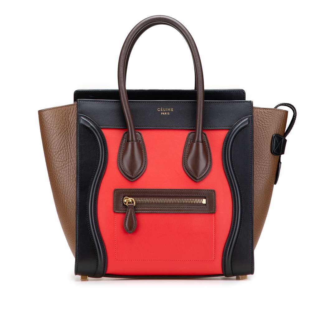 The Luggage Tote handbag features a tricolor leather body, rolled leather handles, top zip closure, front exterior zip pocket, and an interior zip pocket.