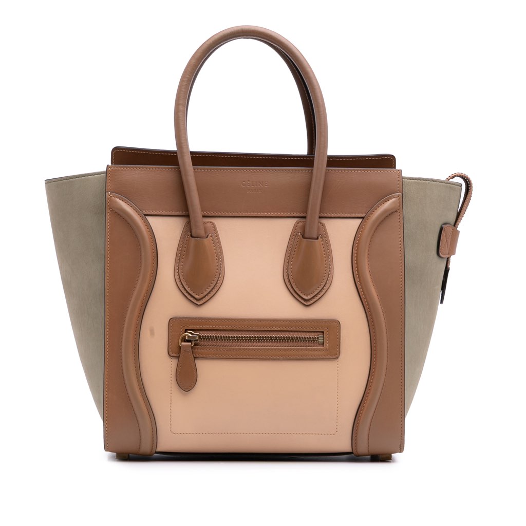 The Micro Luggage Tote handbag features a leather body with suede leather side panels, rolled leather handles, a top zip closure, front exterior zip pocket, and an interior zip pocket. The front was repainted.