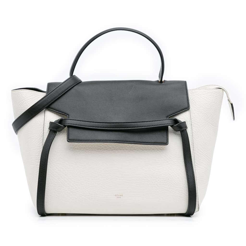 The Mini Belt satchel features a leather body, a flat leather top handle, a detachable flat leather strap, a front flap with a top zip closure, an exterior back zip pocket, and interior slip pockets.