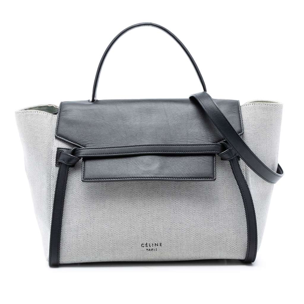The Mini Belt Bag features a canvas body with leather trim, a flat leather top handle, a front flap with a top zip closure, an exterior zip pocket, and interior slip pockets.