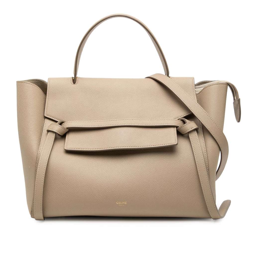 The Mini Belt Bag features a leather body, a flat leather top handle, a detachable flat leather strap, a front flap with a top zip closure, an exterior back zip pocket, and interior slip pockets.