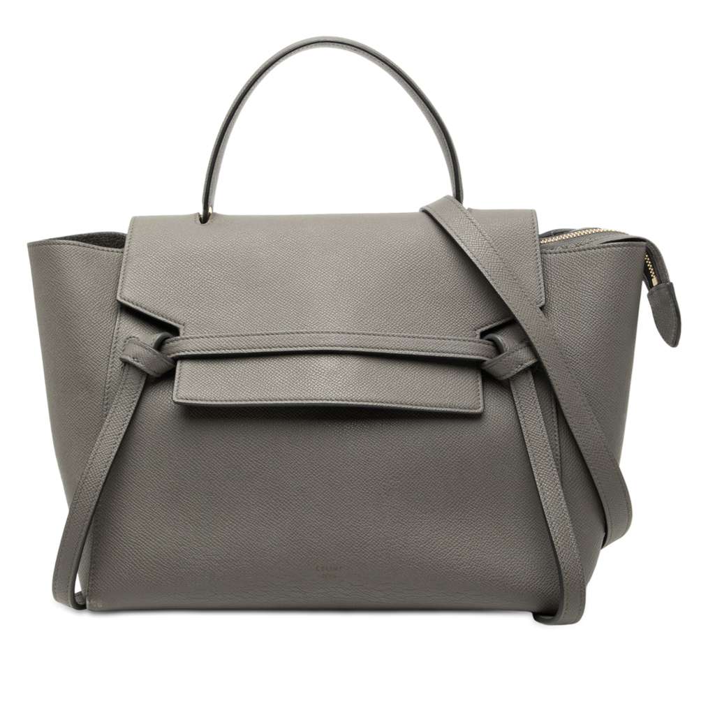 The Mini Belt Bag features a leather body, a flat leather top handle, a detachable flat leather strap, a front flap with a top zip closure, an exterior back zip pocket, and interior slip pockets.